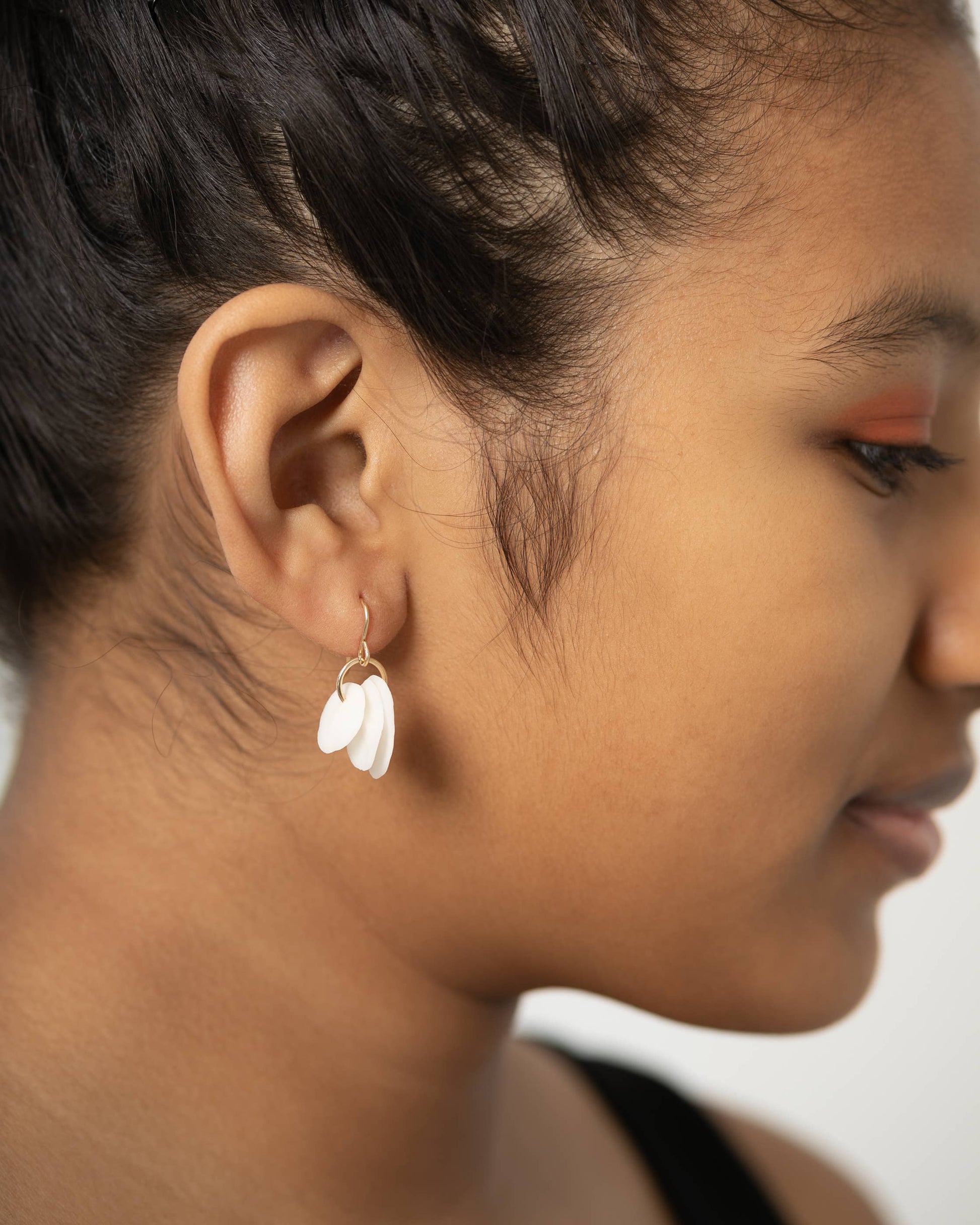 Sweet, simple earrings with three layers of seashell-inspired porcelain on a tiny gold-filled hoop. Handmade porcelain bears the fingerprints of the refugee artisan makers.