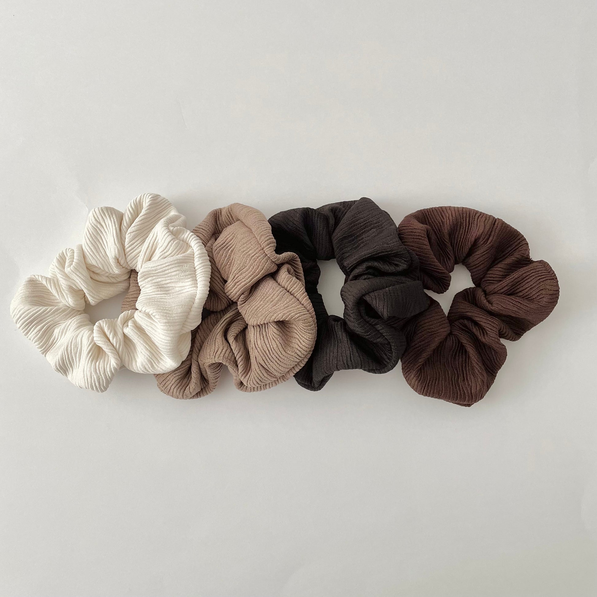 Neutral scrunchies that will become a part of your daily must-haves. Upgrade your top knot or pony, or just wear them on your wrist. Choose from a selection of 4 colours.